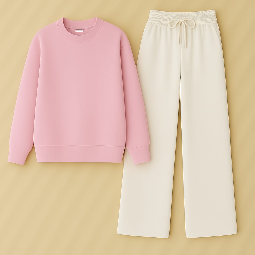 This outfit combines a sweatshirt in soft fleece cotton with black flapper trousers made from the same cozy fabric. The relaxed fit of the sweatshirt pairs seamlessly with the wide, flowy cut of the flapper, creating a stylish yet comfortable look. Perfect for everyday wear, this set balances casual comfort with a sleek modern edge.