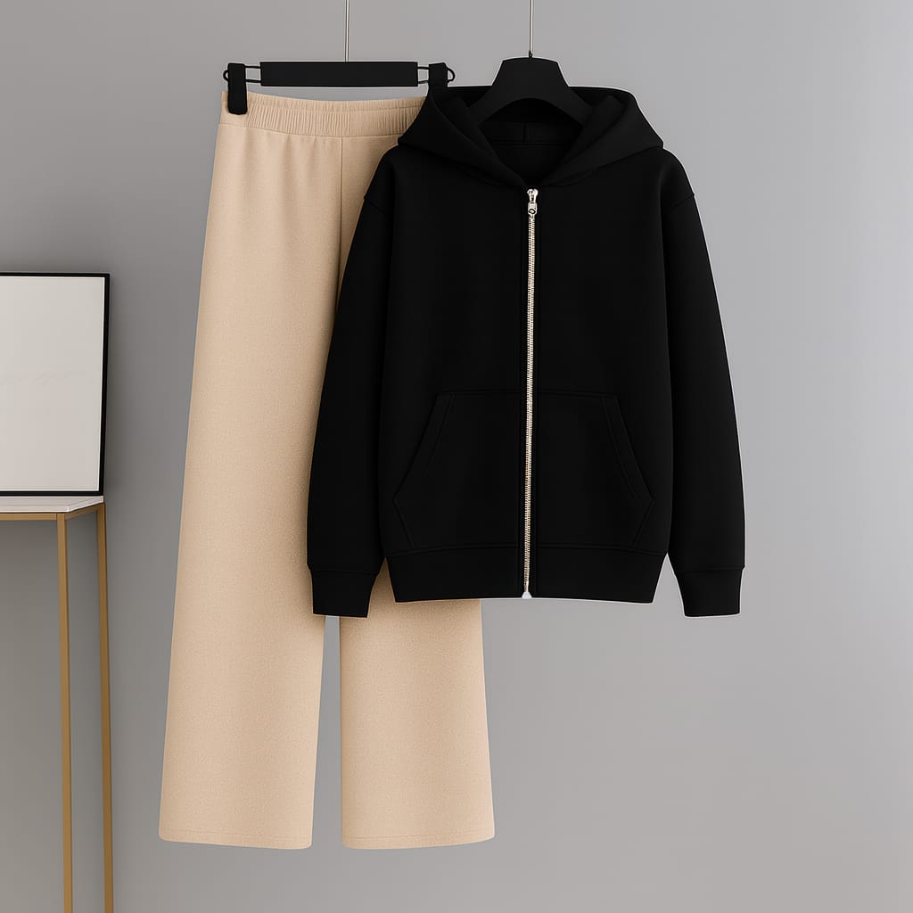 vThis cozy and stylish outfit pairs a soft zipper hoodie with beige flapper trousers for a relaxed yet trendy look. The hoodie is crafted from fleece cotton, providing warmth and comfort, perfect for casual wear. It features a smooth zipper closure and a clean silhouette. The flapper trouser is made from terry fabric, offering a soft texture and a flattering wide-leg fit that adds a touch of effortless elegance. Ideal for everyday wear, lounging, or casual outings.