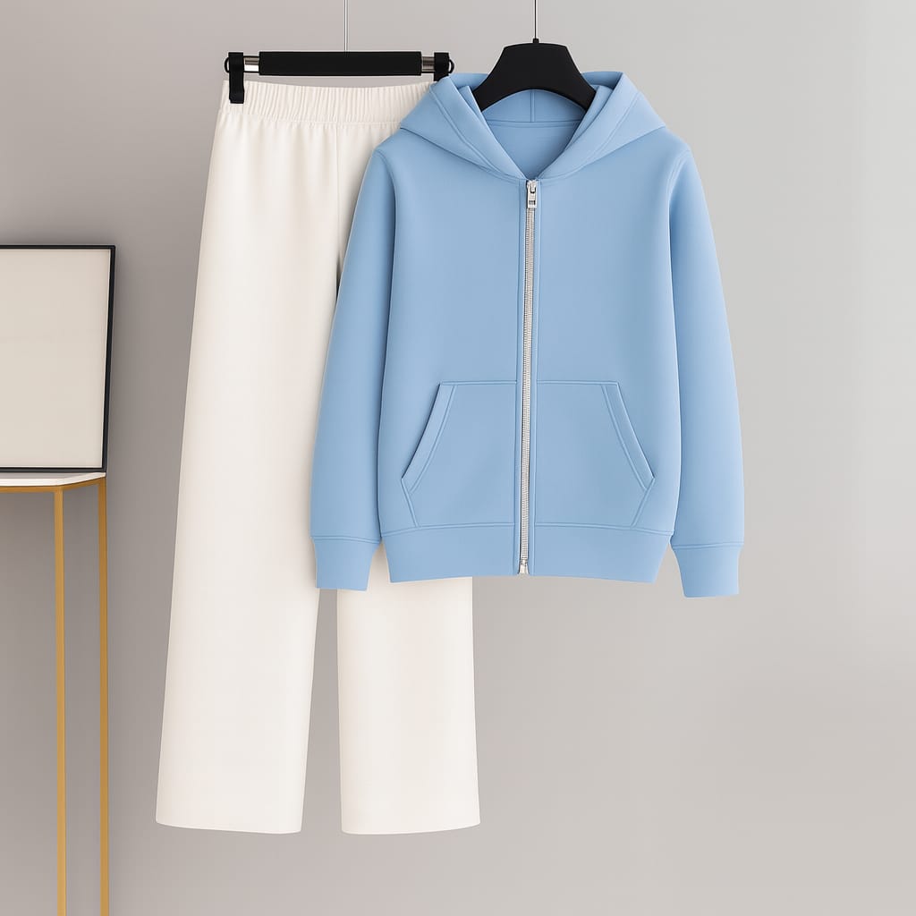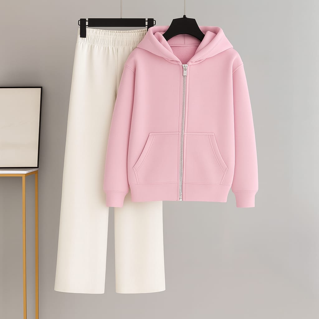 vThis cozy and stylish outfit pairs a soft zipper hoodie with beige flapper trousers for a relaxed yet trendy look. The hoodie is crafted from fleece cotton, providing warmth and comfort, perfect for casual wear. It features a smooth zipper closure and a clean silhouette. The flapper trouser is made from terry fabric, offering a soft texture and a flattering wide-leg fit that adds a touch of effortless elegance. Ideal for everyday wear, lounging, or casual outings.