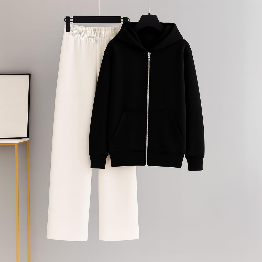 vThis cozy and stylish outfit pairs a soft zipper hoodie with beige flapper trousers for a relaxed yet trendy look. The hoodie is crafted from fleece cotton, providing warmth and comfort, perfect for casual wear. It features a smooth zipper closure and a clean silhouette. The flapper trouser is made from terry fabric, offering a soft texture and a flattering wide-leg fit that adds a touch of effortless elegance. Ideal for everyday wear, lounging, or casual outings.